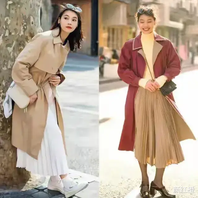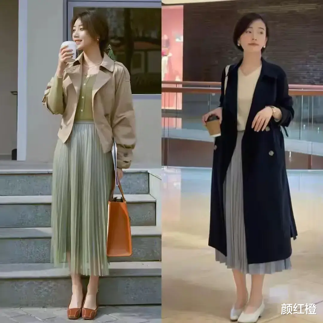 如果长相比较成熟或者是奔三奔四的女性,我个人更推荐大家选择百褶半身裙,因为百褶半身裙符合了以上我们所说的条件,而且很有垂坠感,穿在身上之后特别能把成熟女性展现出优雅感更有气场。例如下面这两位素人博主就分别不同色调的风衣外套加上百褶裙,脚踩一双小白鞋和粗跟单鞋,呈现出来的效果都比较大气。