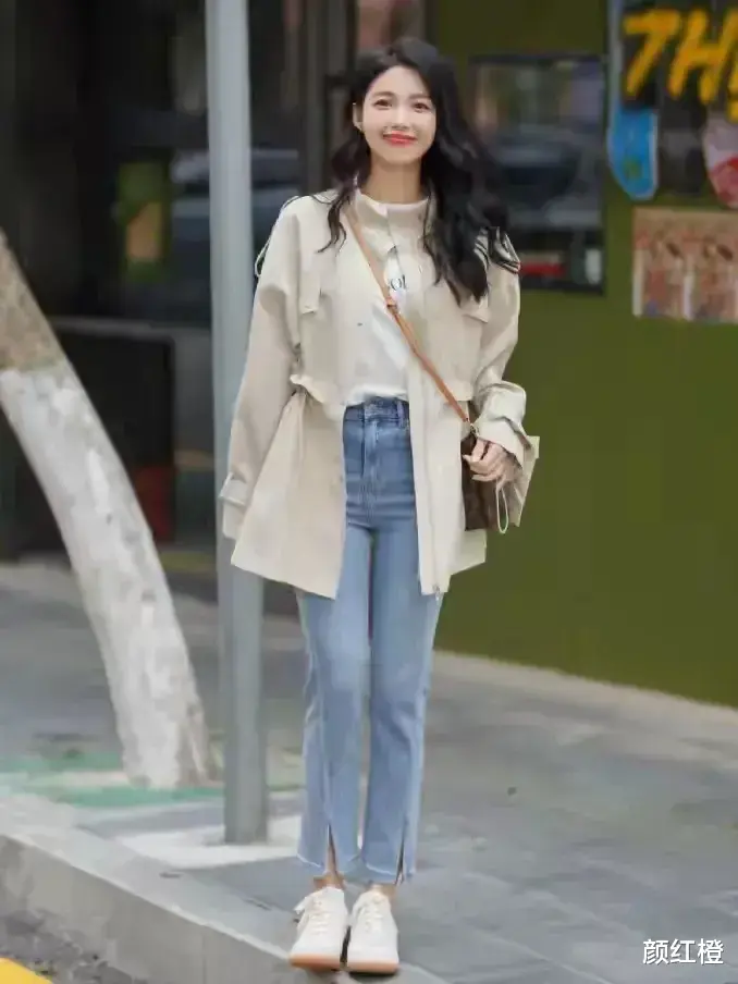 不管你选择什么样的裤子,尽量裤子不要太长,多选一些九分裤到脚踝的位置最佳,穿在身上之后也会更利索,而且不用压深,例如下面这位博主用卡其色的风衣外套搭配上开叉的九分牛仔裤和一双小白鞋轻轻松松穿出时髦感。