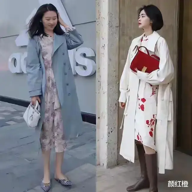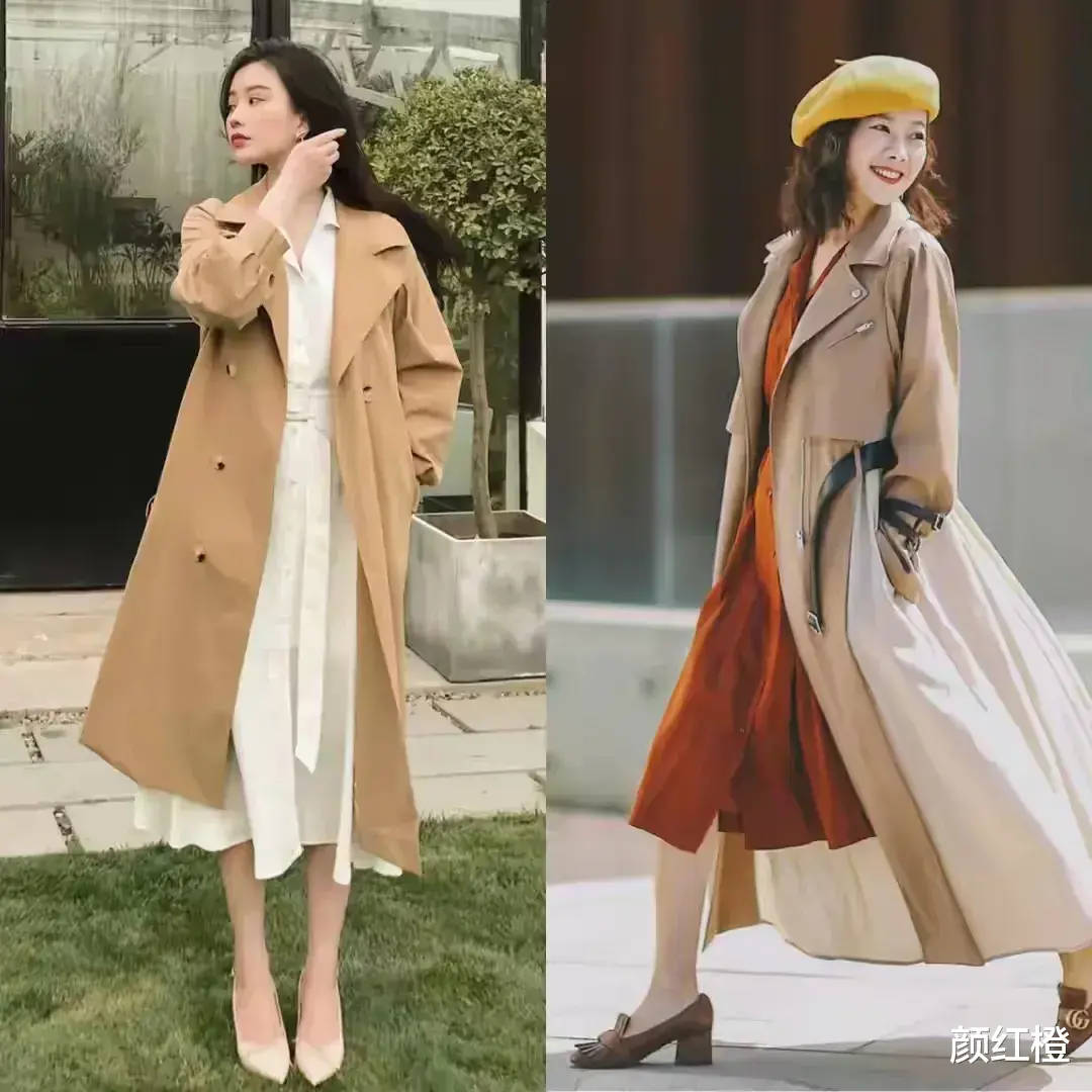 其实对于有胯宽腿粗的女性,我个人更推荐大家选择用风衣加上连衣裙,毕竟大部分亚洲女性梨形身材比较多,我们直接选择长款的连衣裙作为内搭,而且裙长盖过膝盖到小腿肚的位置,能更好的把腿粗和宽的问题都藏起来,再插上一款风衣外套之后,走起路来自带风。