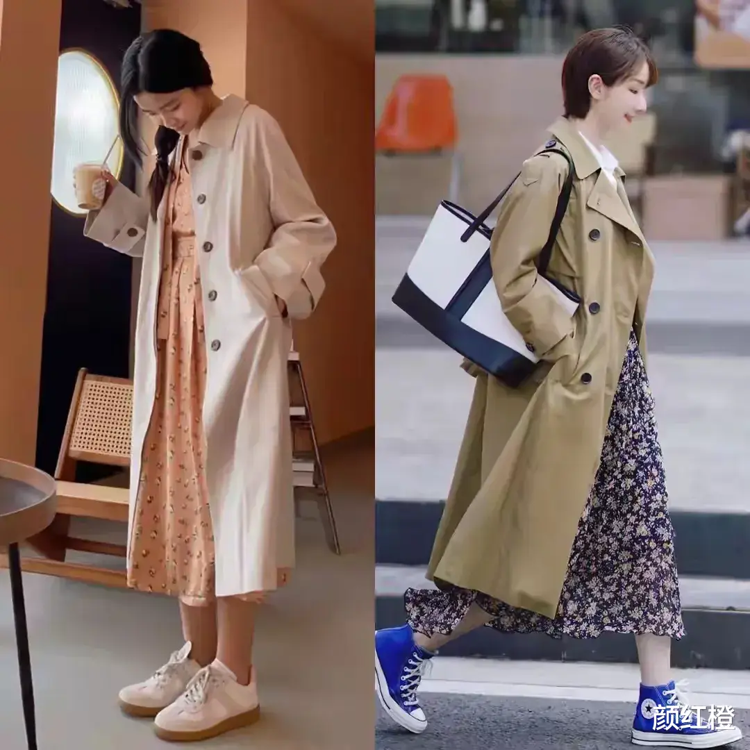 选择裙子的时候,不管是连衣裙还是半身裙,多选一些高腰收腰的设计,而且属于宽松版,不能选包臀裙,例如下面这一条印花的碎花半身裙,裙摆是外扩的款式,是伞状的版型,这样就能达到一个遮肉显瘦的效果,再加上一款卡其色的风衣外套和蓝色的帆布鞋之后,使得穿搭者更时尚,更有气质。