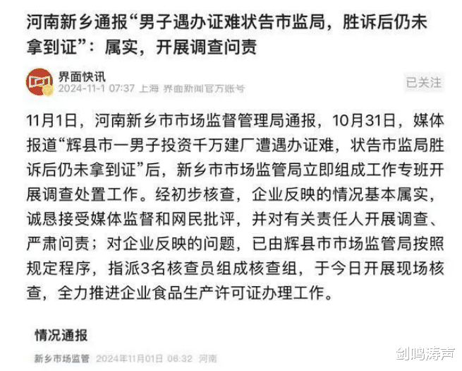 第三,法院判决都没有解决的急难愁盼的老大难问题,媒体一曝光,市级市监局立马通报:指派三人核查组展开工作!请问:你的食品许可证拿到了吗?