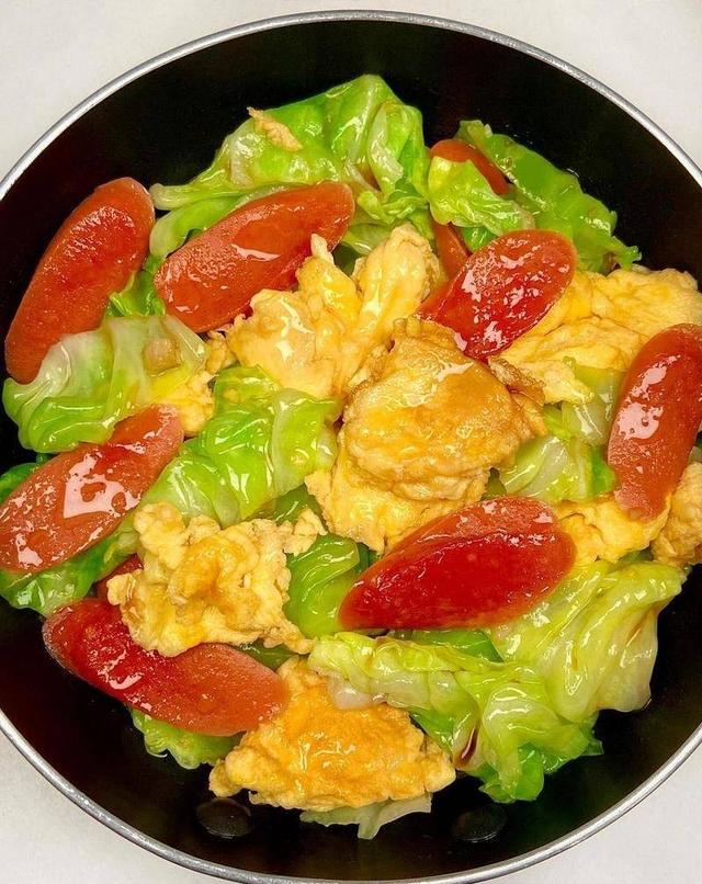 这道菜简单营养,包菜维生素C多,火腿有蛋白质,鸡蛋营养丰富,一起吃营养均衡,味道也不错。别炒老鸡蛋和包菜。