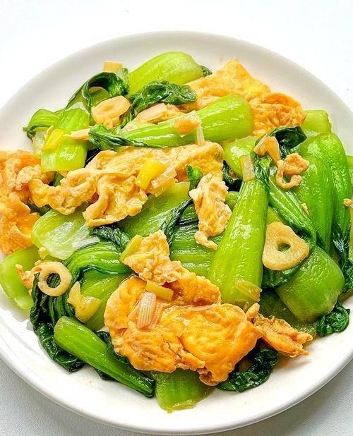 食材: 油菜200克,鸡蛋2个,葱花适量,蒜末适量。