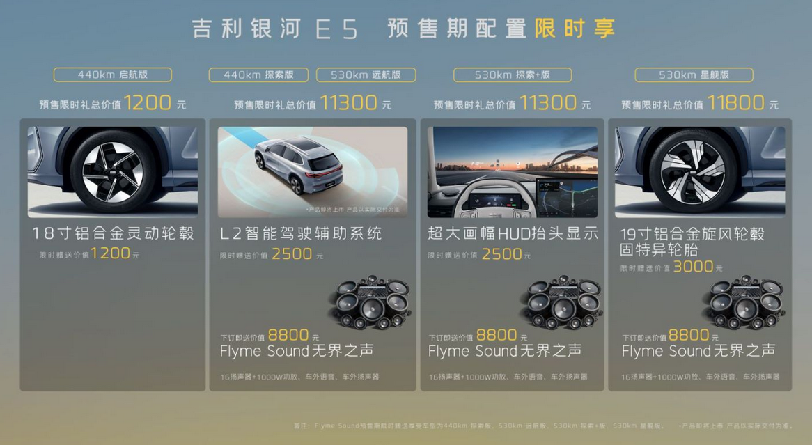 总之,吉利银河E5预售开启了,他给出的福利真的是诚意满满,几千块钱的配置说送就送,一点也不带眨眼的,现在下订到时候还可以抢先提车,比人提前一步感受到E5的实际驾驶体验哩。