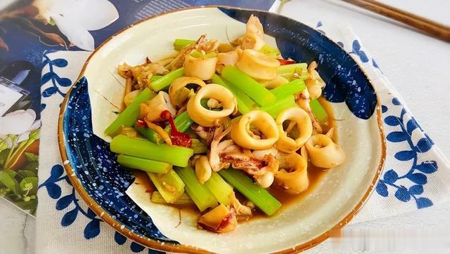 放入芹菜段,淋入少许热水翻炒至断生即可