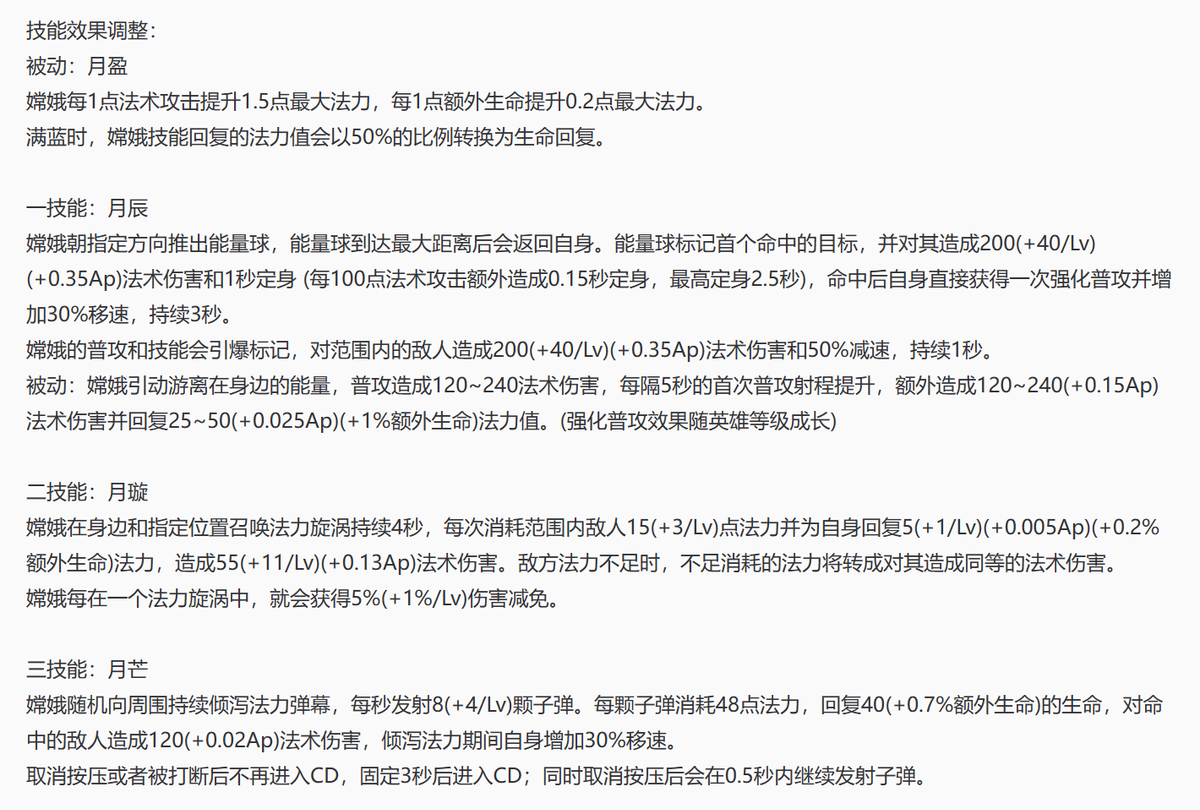 嫦娥的定位是战斗法师,由此可以看出,策划是想让嫦娥摆脱法坦的属性,晋升为战士。为此,策划移除了蓝量减伤的设定,以及蓝量增伤的效果,让嫦娥不再过于依赖蓝量生活。嫦娥的基础生命值翻倍,攻速增加,这和其他法师一样。技能调整方面,嫦娥满蓝时法力值50%转为血量,这是嫦娥高续航的基石。一技能增加往返效果,距离较长,嫦娥的拉扯能力提升。