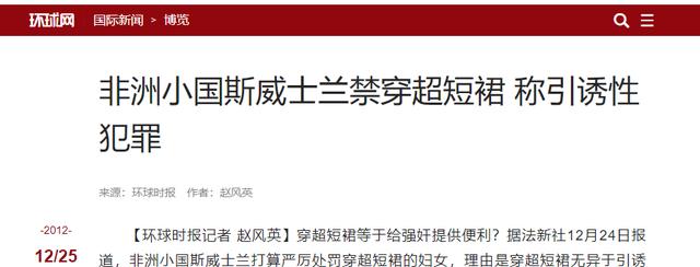 环球网——《非洲小国斯威士兰禁穿超短裙 称引诱性犯罪》2012-12-25