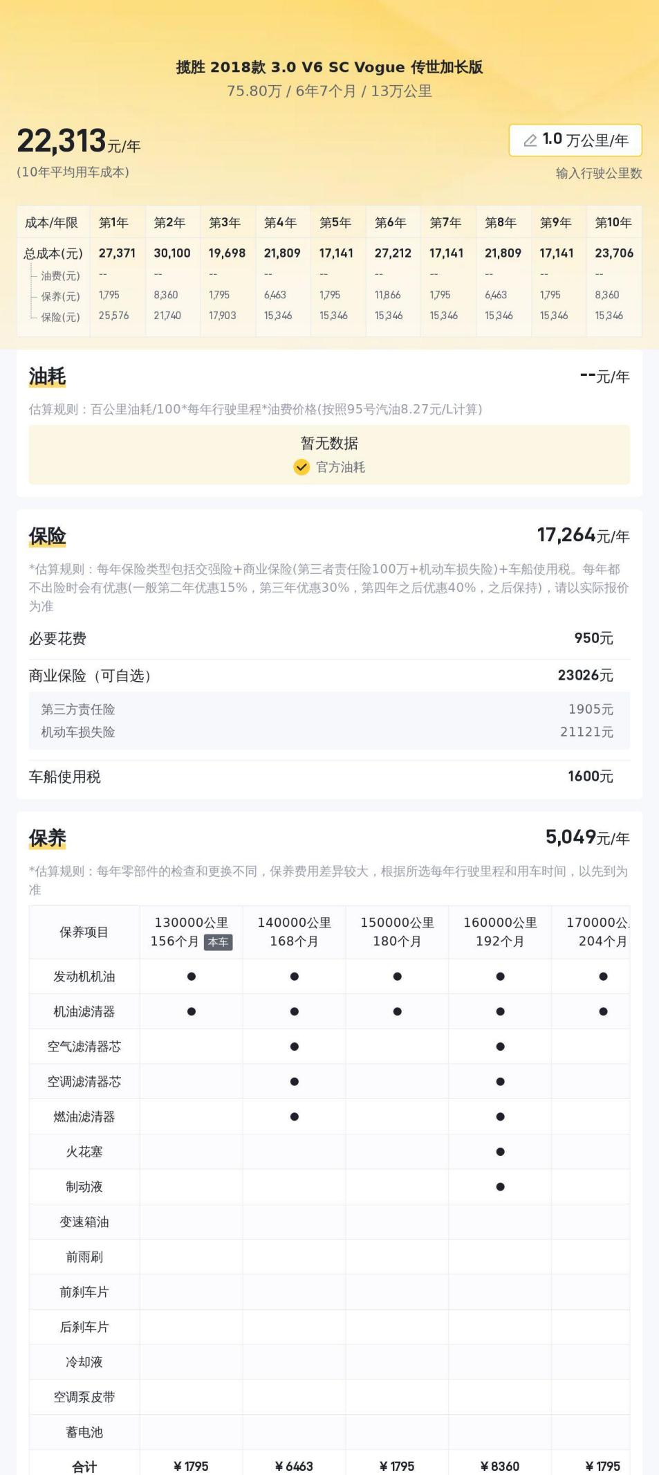 养车成本方面,揽胜的油耗、保险费用以及保养费用都相对较高。这也是购买豪华SUV需要考虑的一个重要因素。根据原文提供的数据,该车10年平均用车成本约为23678元/年,这对于普通家庭来说,无疑是一笔不小的开支。
