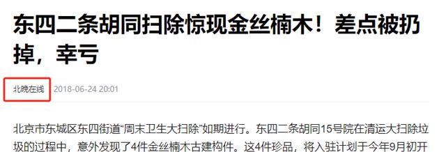 北晚在线《东四二条胡同扫除惊现金丝楠木!差点被扔掉,幸亏》,2018-6-24