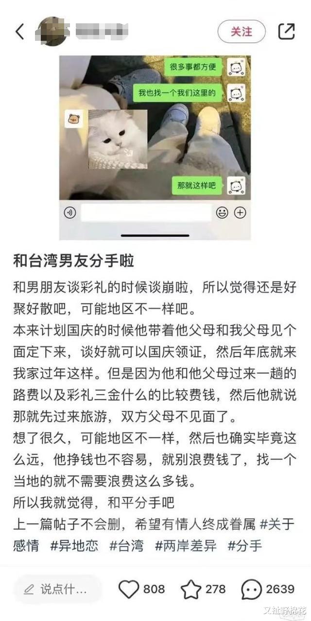 最终,因为这位台湾女生的评论,发帖女生表示“那我还是找大陆的吧”