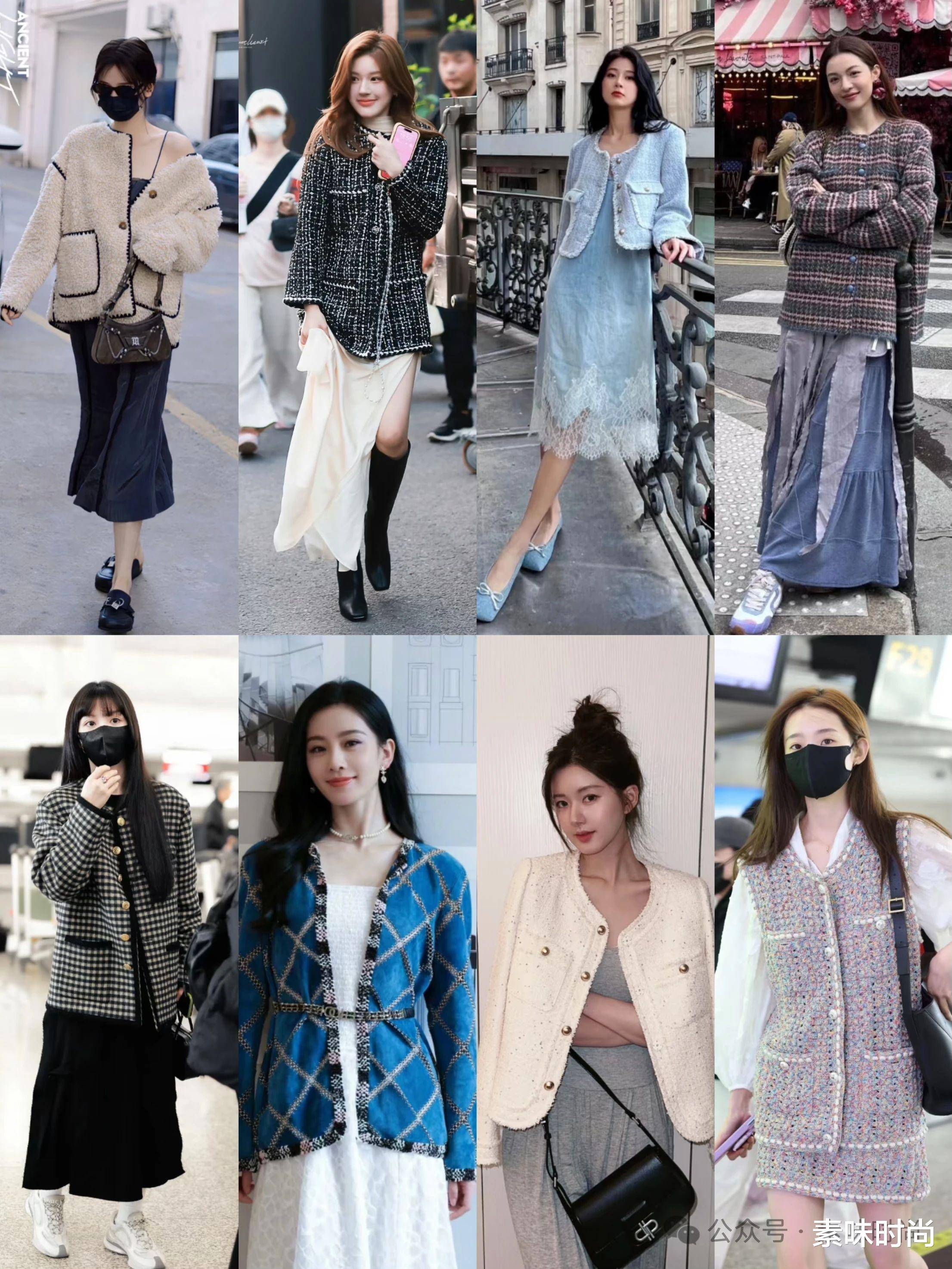 若选择短款的小香风外套搭配蓬蓬裙式的连衣裙,瞬间营造出甜美可爱的风格。蓬蓬裙的俏皮灵动与小香风外套的精致奢华相互映衬,减龄效果显著,适合约会或参加轻松的聚会场合。