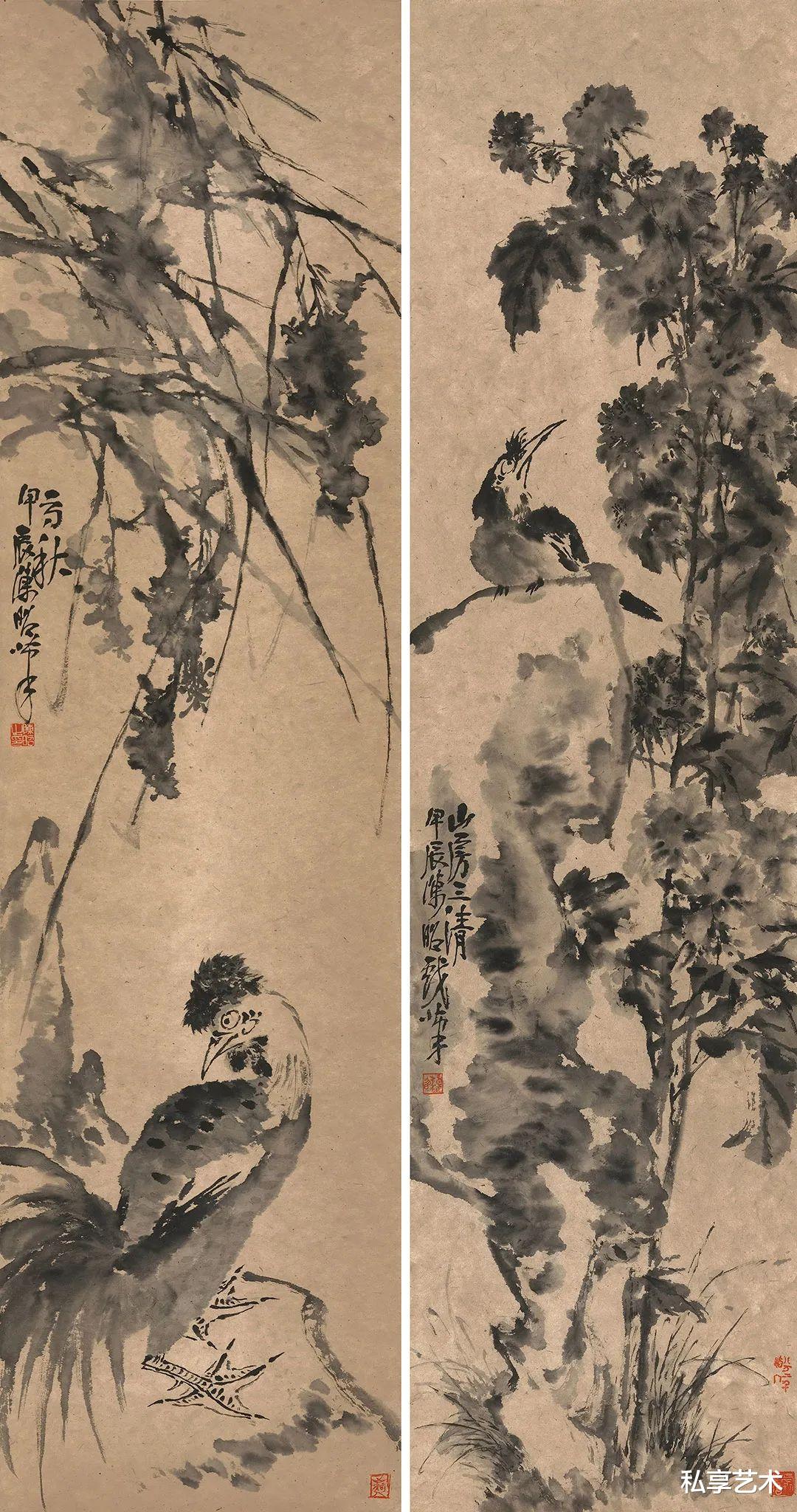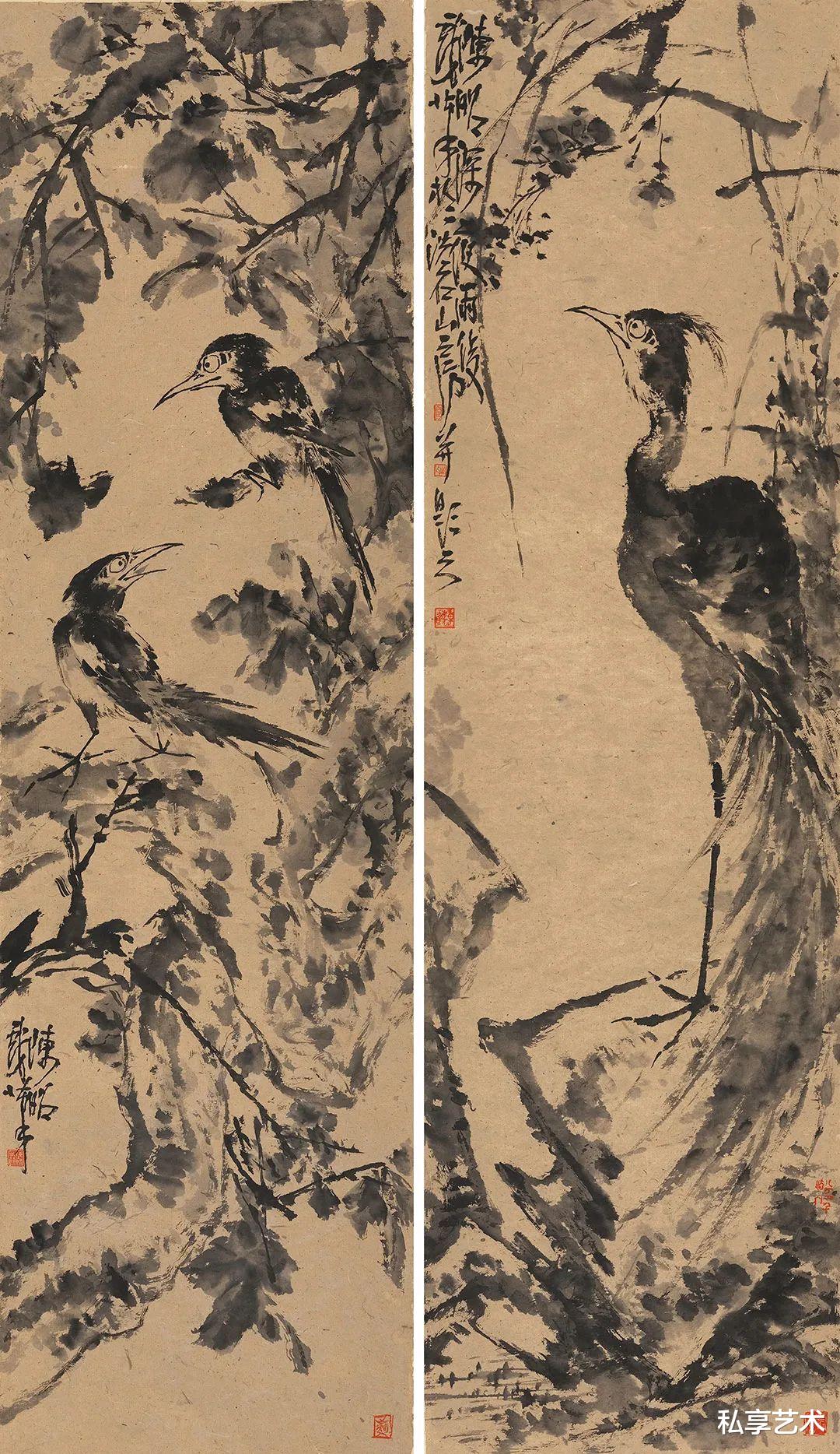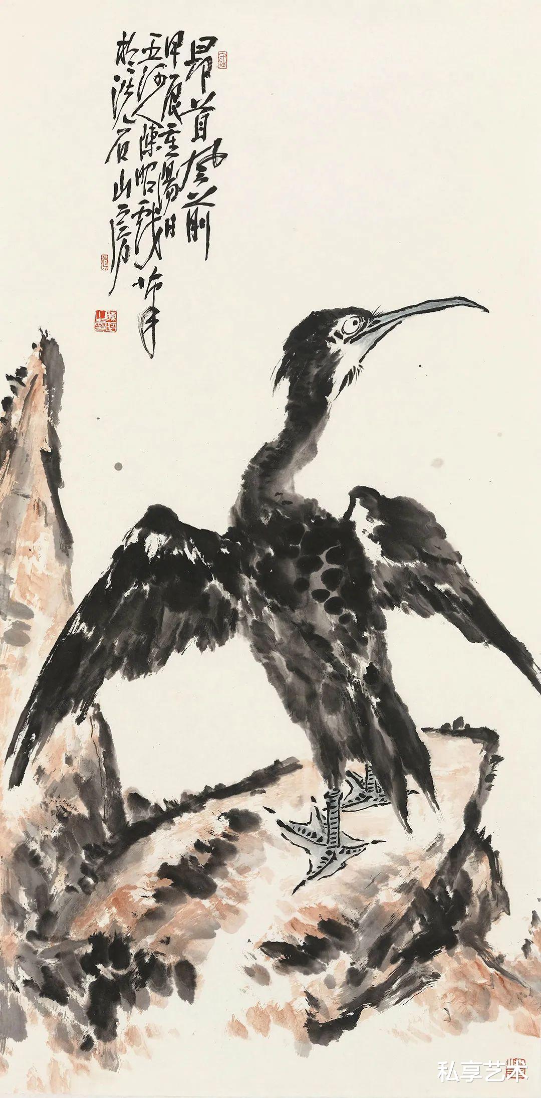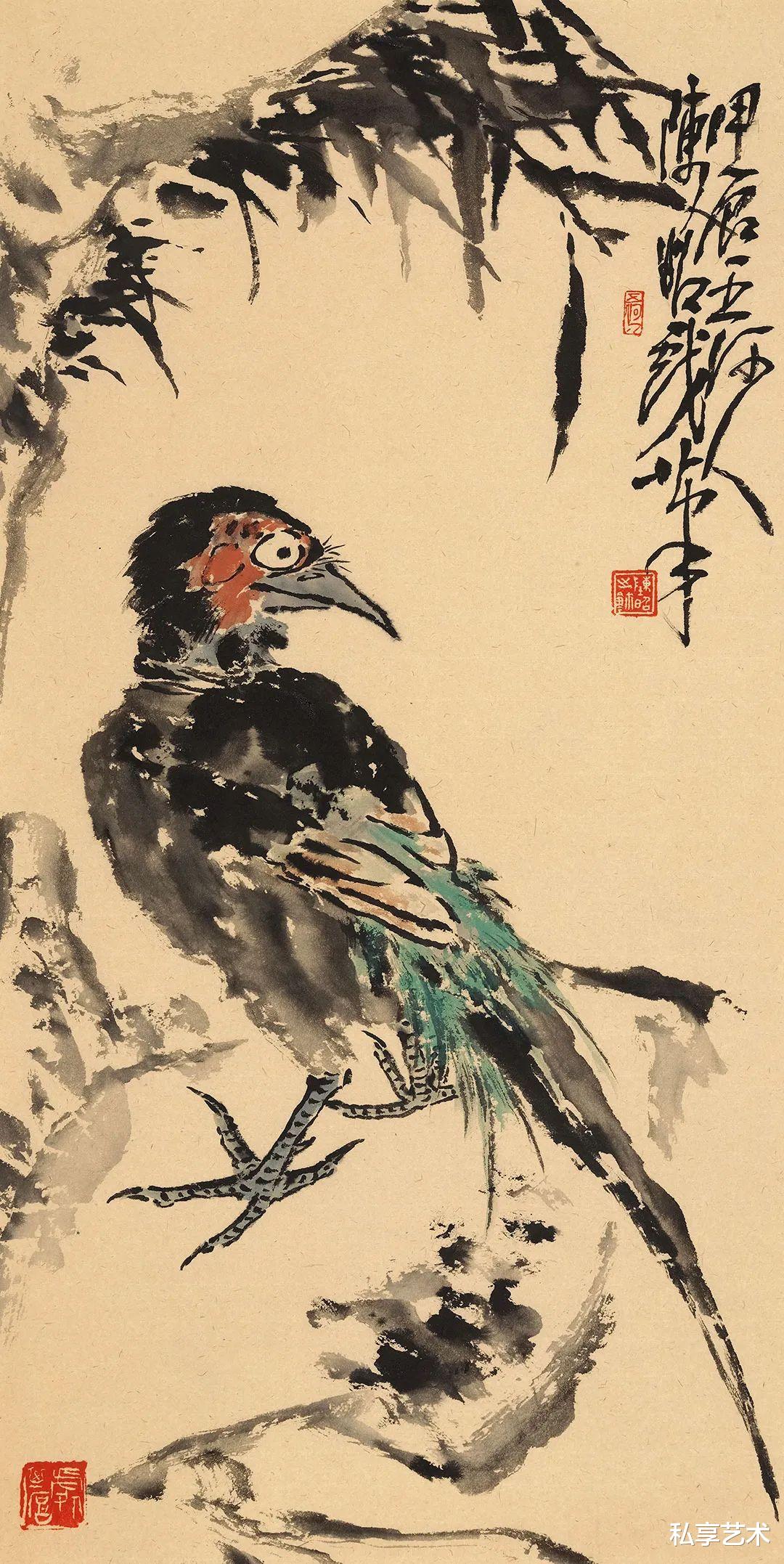 写意是中国画的灵魂,亦是主要表达形式,大写意花鸟画历代大家辈出,又有万千变化的品格意象,陈昭在此道中探索出新意尤为难得。他的作品贵在得"真",五代荆浩曰:"搜妙创真""真者气质俱盛",陈昭舍弃当下一些流行样式,遵循自我本性,在写意本体中深入锤炼,度花卉禽鸟的物象取其真意,以写意的形式语言生发出自我真性情。笔墨苍润,意趣活泼。他立足于花鸟画中金石书写的大脉络,讲究以笔写形,由笔见势。章法布局从吴昌硕花鸟画的形势衍生而来,又融入自我的写生内容与生活体验,从物象中"写其真意",化画谱图式为鲜活景致。在用笔设色中吸收黄宾虹花鸟画的"非标准化"的形式与趣味,采取疏脱简散状态的笔法,使造型韵律松活,不拘于外形色调。吴黄这两家形式与笔法差异很大,陈昭把这两家做了一个很好的融合。从笔墨的丰富度和趣味性上吸收黄宾虹的高古篆籀意趣,章法整体沿承吴昌硕的大开阖布局节奏,在大写意花鸟画创作上做出拓展和提纯。