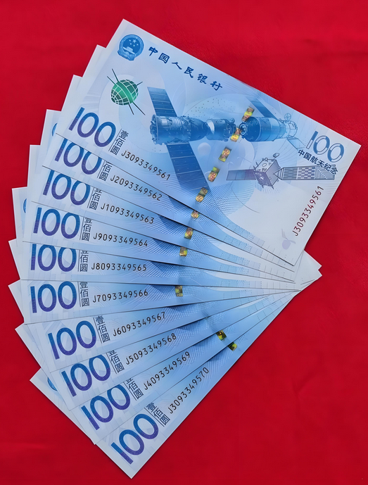 航天钞大家并不陌生,是中国人民银行于2015年11月26日发行的,与此同时还发行了一枚航天纪念币,面值10元,双金属合金的,与前面发行的建国钞、龙钞一样都是一币一钞。