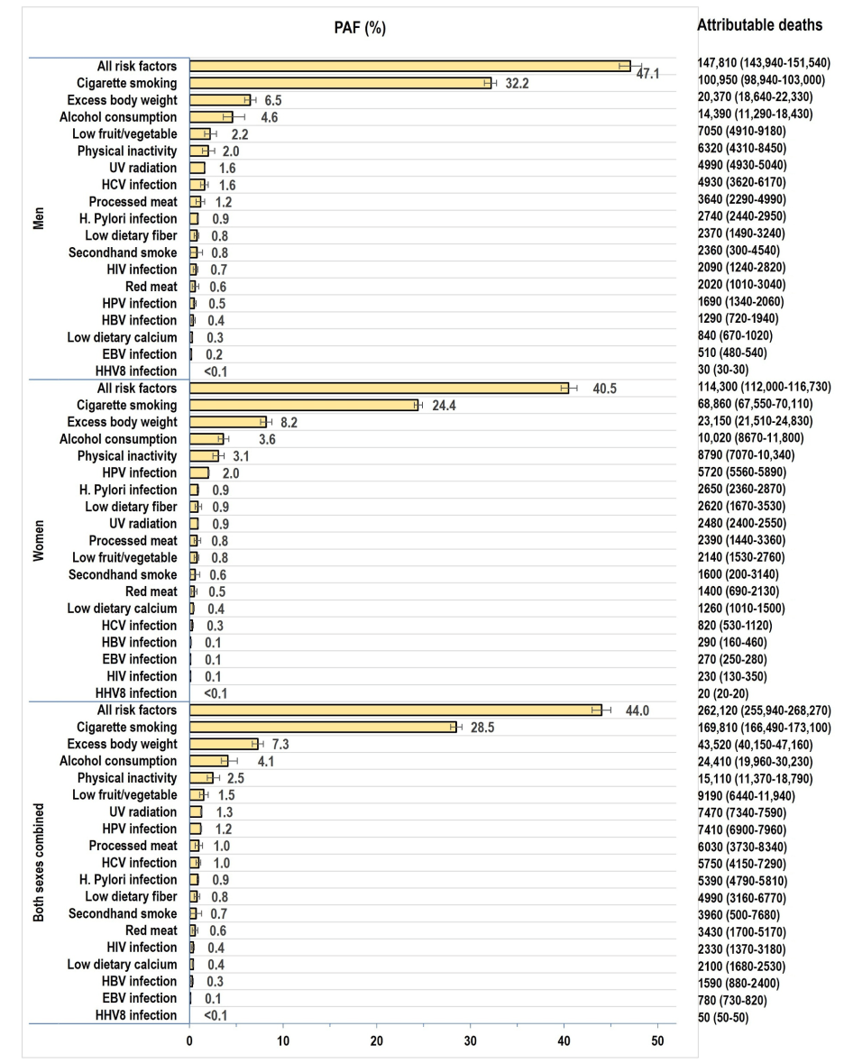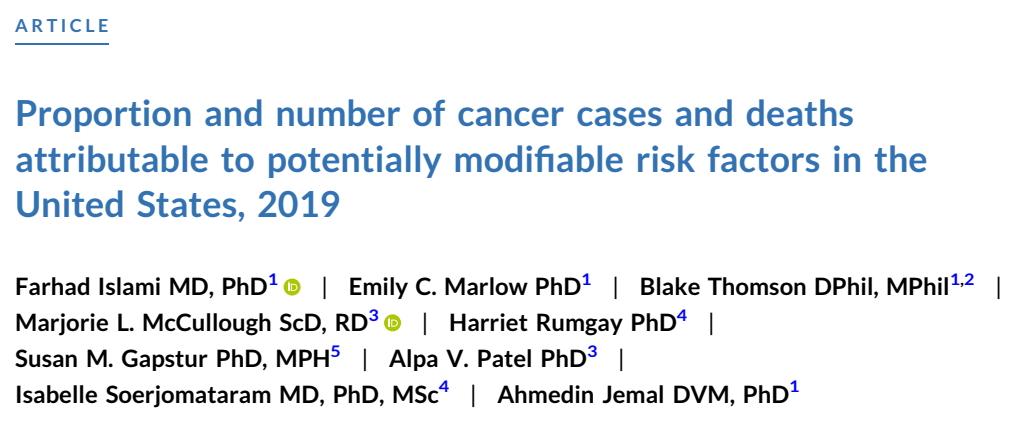 [1] Islami F, Marlow EC, Thomson B, et al. Proportion and number of cancer cases and deaths attributable to potentially modifiable risk factors in the United States, 2019. CA Cancer J Clin. 2024;1‐28.