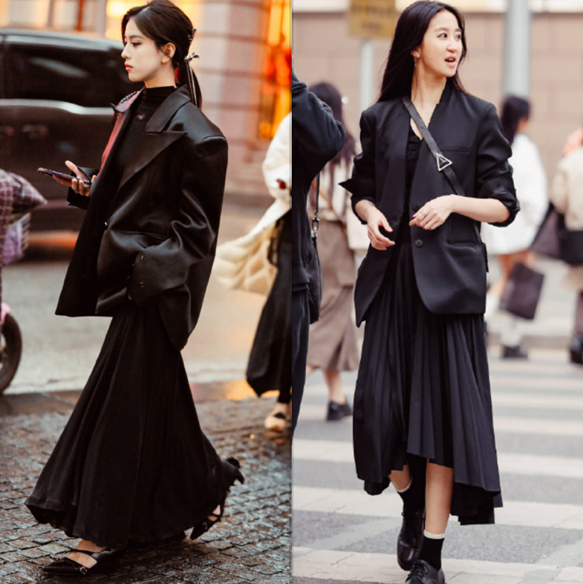 有人觉得西装过于刻板和老气,西装单品选择裙装进行搭配便能够化解这种感觉,当西装选择了搭配百褶裙,更加有女性的气质。