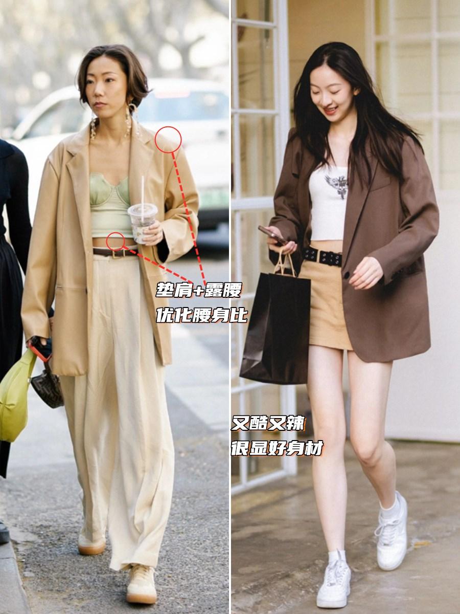 廓形西装下面搭配短裙,并且裙摆长度不超过衣长,这种“下衣失踪”的搭配方式,不仅强化了造型时尚感,同时也增加了腿部留白面积,拉长视觉更显高,小个子女生也能轻松驾驭。