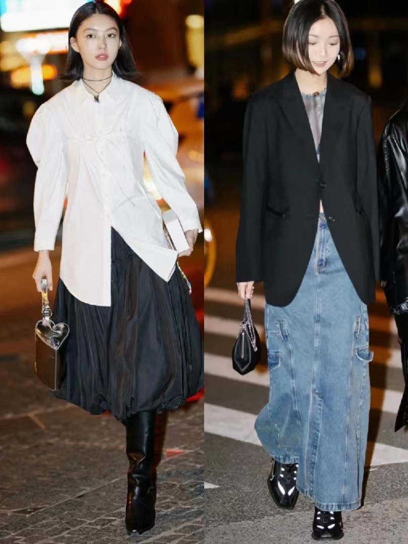 因为牛仔的面料本身风格要休闲一些,当我们通过牛仔裙去搭配西装的时候,就会让整个造型的风格也变得更休闲,没那么严肃正经。