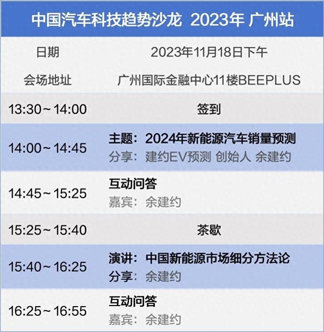 由“建约EV预测”和“建约车评”主办2023年第三期中国汽车科技趋势沙龙将于11月18日在广州举行。