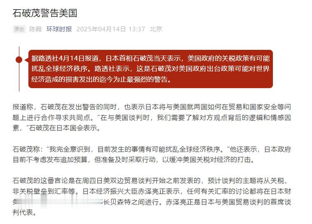 14日,石破茂直接警告“美政府关税政策,会扰乱全球经济秩序”,他甚至还透露“对此日本没打算‘退让’,就连关税谈判也不会着急。”