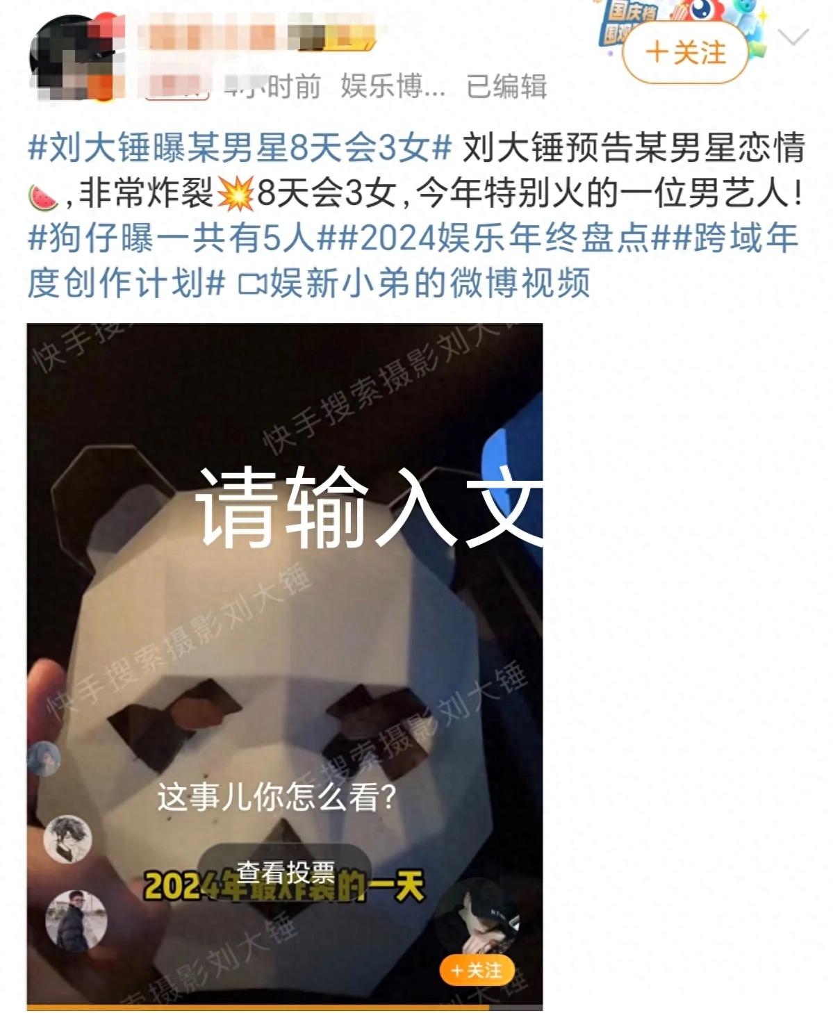 听刘大锤说完,提取到了两方面信息,第一,他是2024年特别火的男艺人,第二,该男艺人八天会三女。听起来确实挺炸裂的。