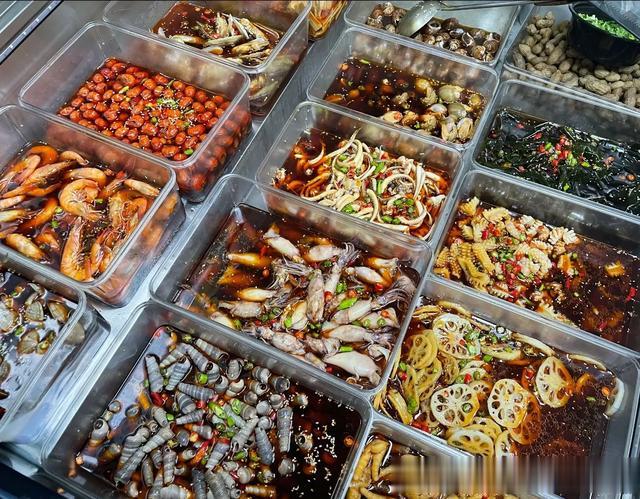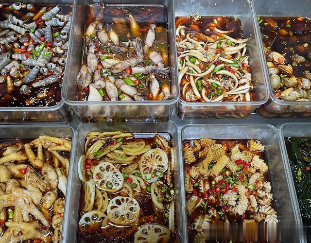 3.卤水烧开,根据海鲜煮制时间,先后下入卤水中煮制,捞出放入冰水中浸泡,彻底凉透后,捞出控干水分,分类摆放容器中,浇上捞汁,汁水淹没过海鲜即可,加盖密封,放入冷藏冰柜,腌制2小时以上即可完成。