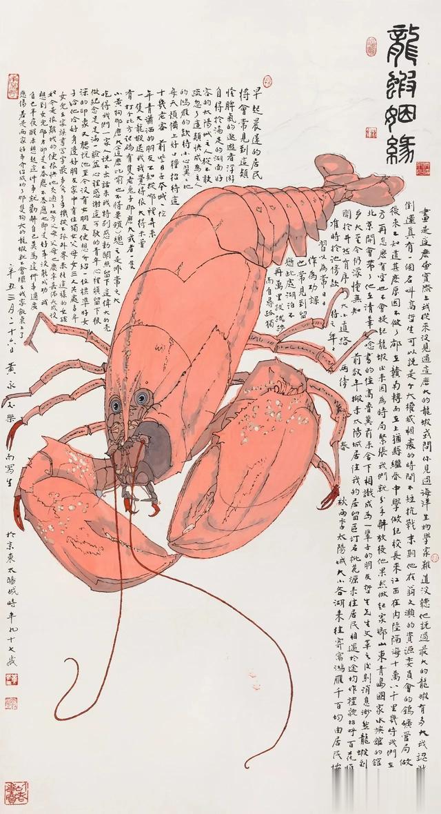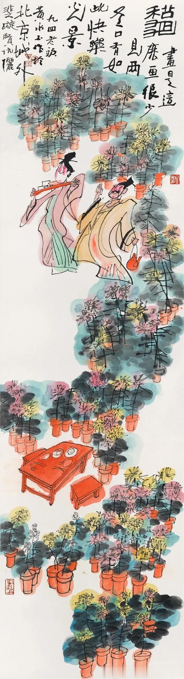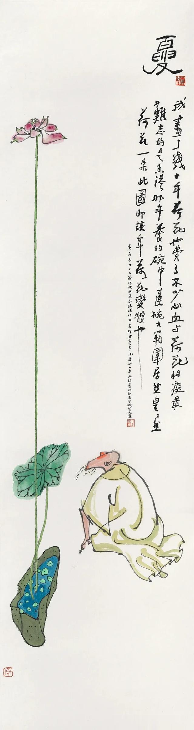 黄永玉作为艺术家,一生涉猎的艺术领域非常广泛,在中国画、版画、油画,还有雕塑、陶瓷、平面设计、工业设计、建筑设计等方面都留下精彩的作品。而此次展览主要呈现的是他中国画的作品,这批作品中最早的创作于2015年,最晚的作品作于2023年去世前不久。虽然创作时间的跨度不大,但是这批作品数量众多,类型多样,题材涉猎更是广泛,涵盖了古装人物、现代都市、花卉、动物、生肖、摔跤等各种题材。90岁后的黄永玉,依然对身边的一切保持着新鲜感,他对生活中的新事物细心观察,敏锐捕捉,寓所里新种植的花卉宝莲灯,小区院子里的玉簪花,湖边远方飞来的大雁,朋友送来的大龙虾都成为他画中的主角。在展览中,还有一批非常精彩的“摔跤”作品,用笔虽然简约,但是对摔跤手一招一式动作的抓取十分精准,配合着线条的粗细变化和晕染,摔跤动作的动态被展现的十分生动。