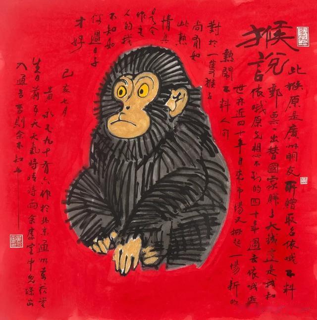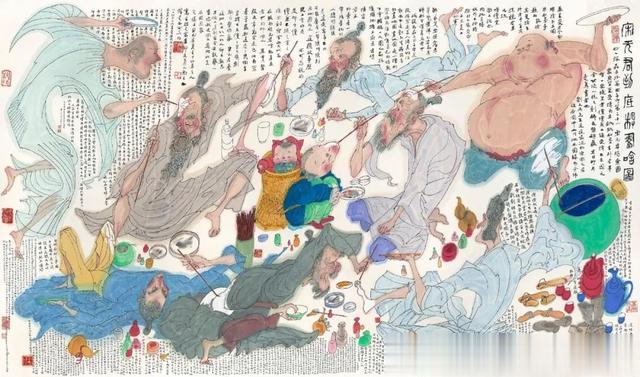 欣赏黄永玉的作品,不仅仅是看画面表现的内容,更重要的是要读画中的题跋。此次展出的作品更是如此,少则数十字,多则数百字,更有如《宋元君到底想画啥图》这样的作品,画中题字多达上千字,相当于一篇精彩的短文了。这些文字也与传统题跋的表意抒情有所不同,而是处处透露着黄永玉独特的幽默风格。他自己也曾说“文学在我的生活里面是排在第一的,第二是雕塑,第三是木刻,第四才是绘画。”他把自己的文章写到了画面里,并且和画面的内容相结合。吴洪亮评价“依然到处都是视觉惊艳和脑筋急转弯。满满的金句彰显黄氏幽默,带着乡土气息,搅拌着湖南人的霸蛮与灵泛。”细读这些作品,我们不但可以了解作品背后的故事,更能看到一位百岁老人对青春的回忆,对生活的热爱和对人生的感悟。这份冷静、睿智、风趣、幽默,汇聚成一个如此有趣的画展。