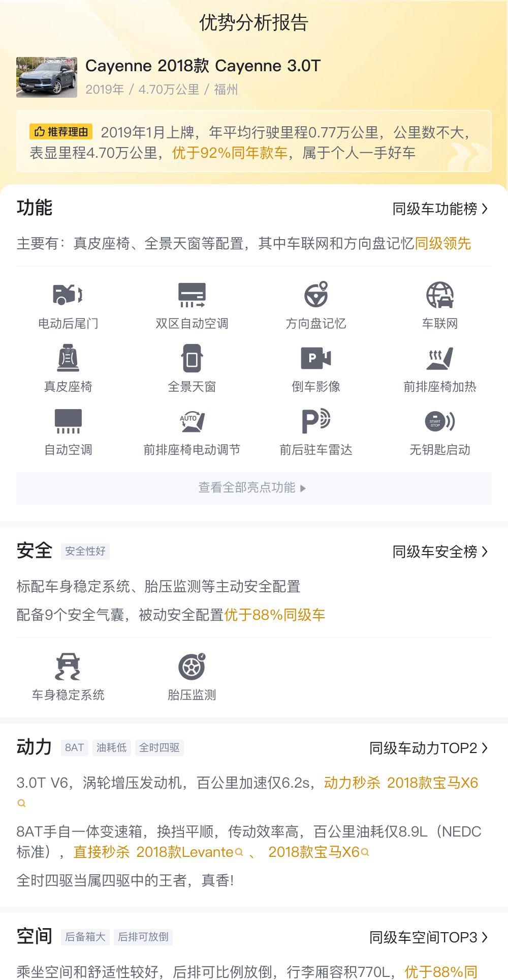 我们可以对比一下同款车型在其他平台的售价。根据市场行情,2018款 Cayenne 3.0T 的二手车价格普遍在45万到55万之间。这辆车的报价47.6万,处于中等水平,不算特别便宜,但也算合理。