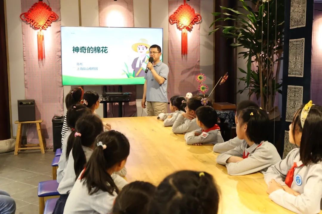春播活动从一场《神奇的棉花》的科普讲座拉开序幕,上海辰山植物园高级工程师陈彬博士详细讲述了这株植物的迁入、种植历史、品类特征及价值贡献等。孩子们在了解棉花的基础上,用彩棉花束敬献被誉为“先棉”的黄道婆纪念像。