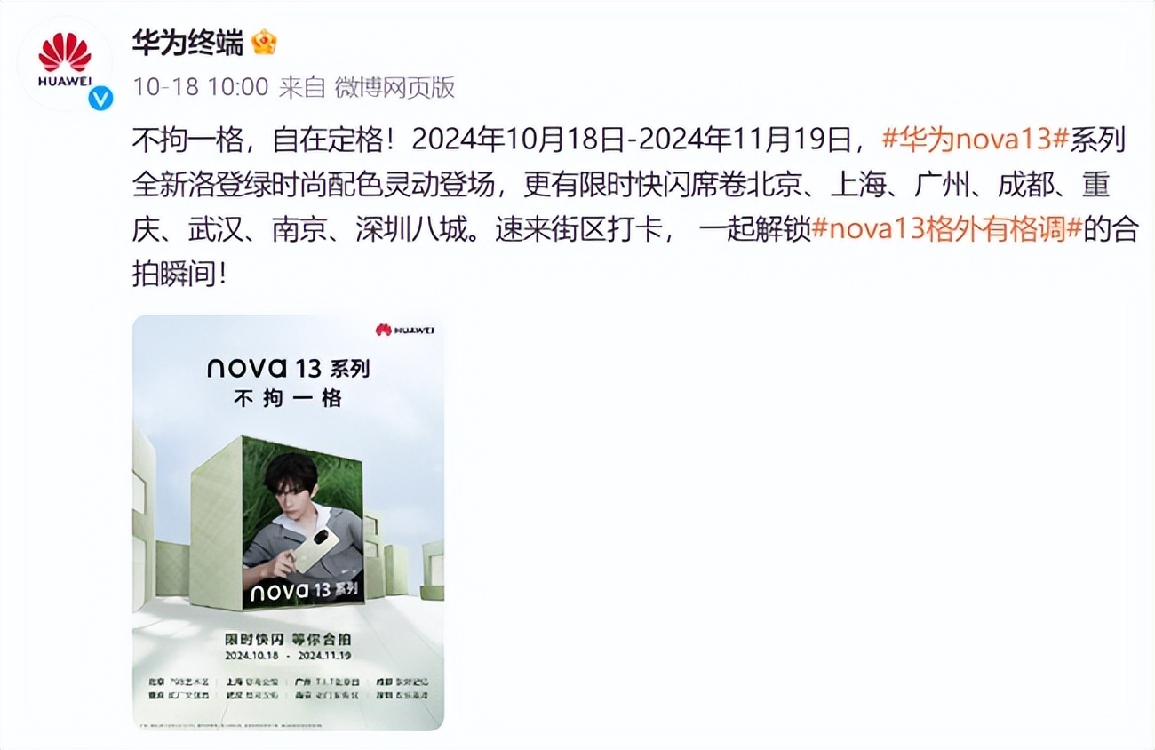 在追求个性与潮流的当下,华为nova系列始终走在时尚与科技的前沿,成为年轻人表达自我、展现个性的重要载体。近期,随着华为nova 13系列的到来,一场由华为nova 13系列所引领的时尚风暴正在全国各大城市悄然兴起,为年轻人的生活增添了一抹亮丽的色彩。