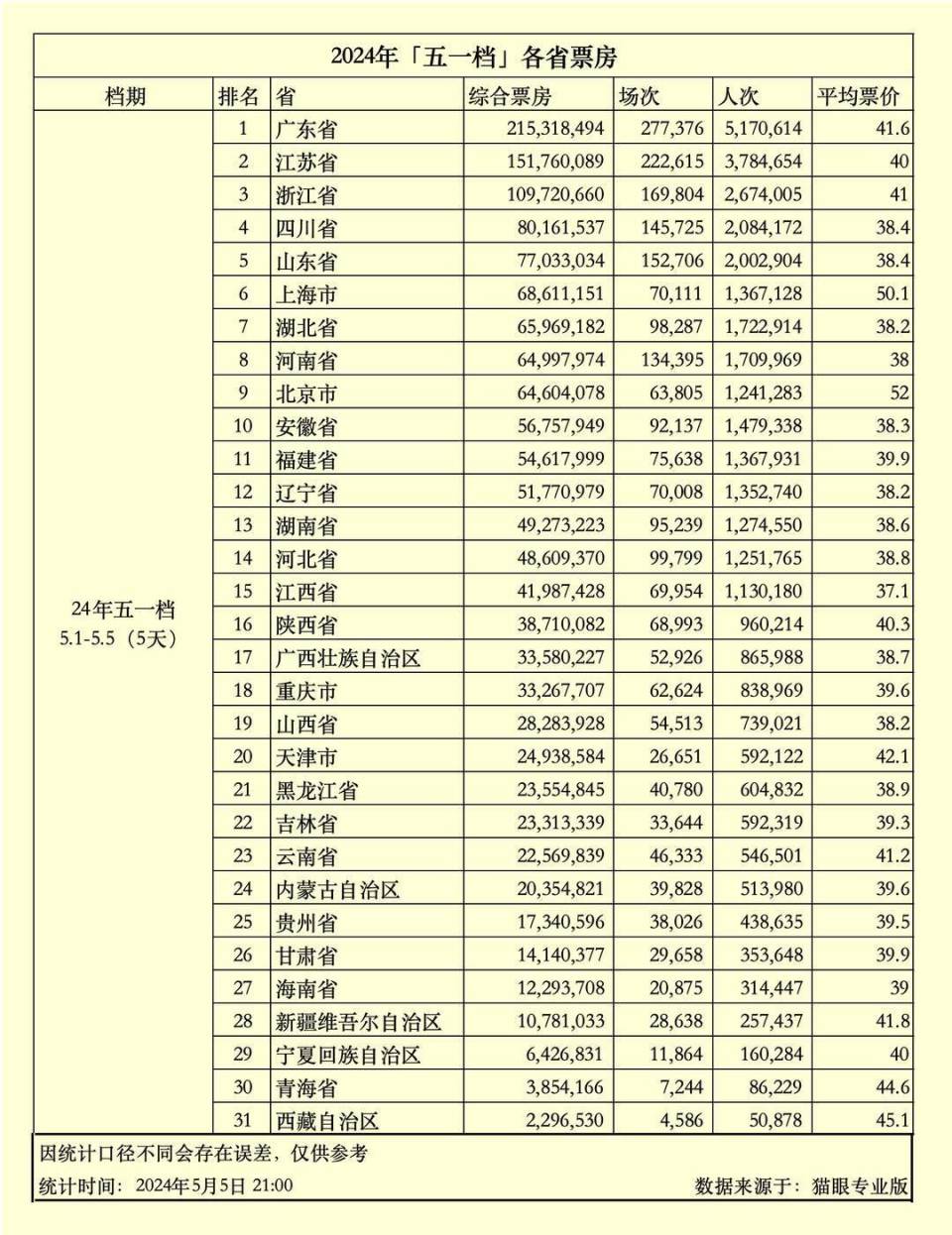 在省份票房排名中,广东省以215,318,494元的综合票房遥遥领先,江苏省和浙江省分别以151,760,089元和109,720,660元位列第二和第三。四川省和山东省紧随其后,显示出这些省份在电影市场上的强大吸引力。值得注意的是,北京市虽然在城市排名中位列第二,但在省份排名中并未单独列出,可能是因为北京市作为直辖市,其数据在省级统计中被合并计算。