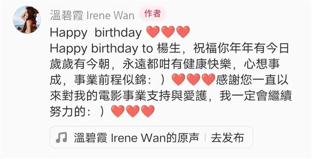 她在社交媒体上也发文,诚挚地祝福杨受成生日快乐。