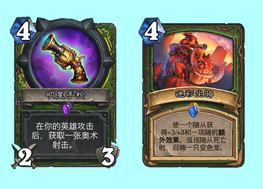 这波公布的新卡里,还有一部分是之前因为现实事件而延期的猎人新卡,而看起来明星手枪就是导致延期的“罪魁祸首”了,这把武器没什么好说的,奥术猎可能会带,但其他卡组带就太亏了。迷彩坐骑有点像暴风城版本的坐骑机制,当时猎人拿到的是山羊坐骑,额外效果分别是:复生,吸血,剧毒,潜行,风怒,突袭,嘲讽,圣盾,掉落的变色龙也会带这些效果,大概率和原本随从获得的随机效果是一致的。顺带一提,这张牌的卡图真的好像dota2里的电炎绝手,难道这就是老奶奶青春版?