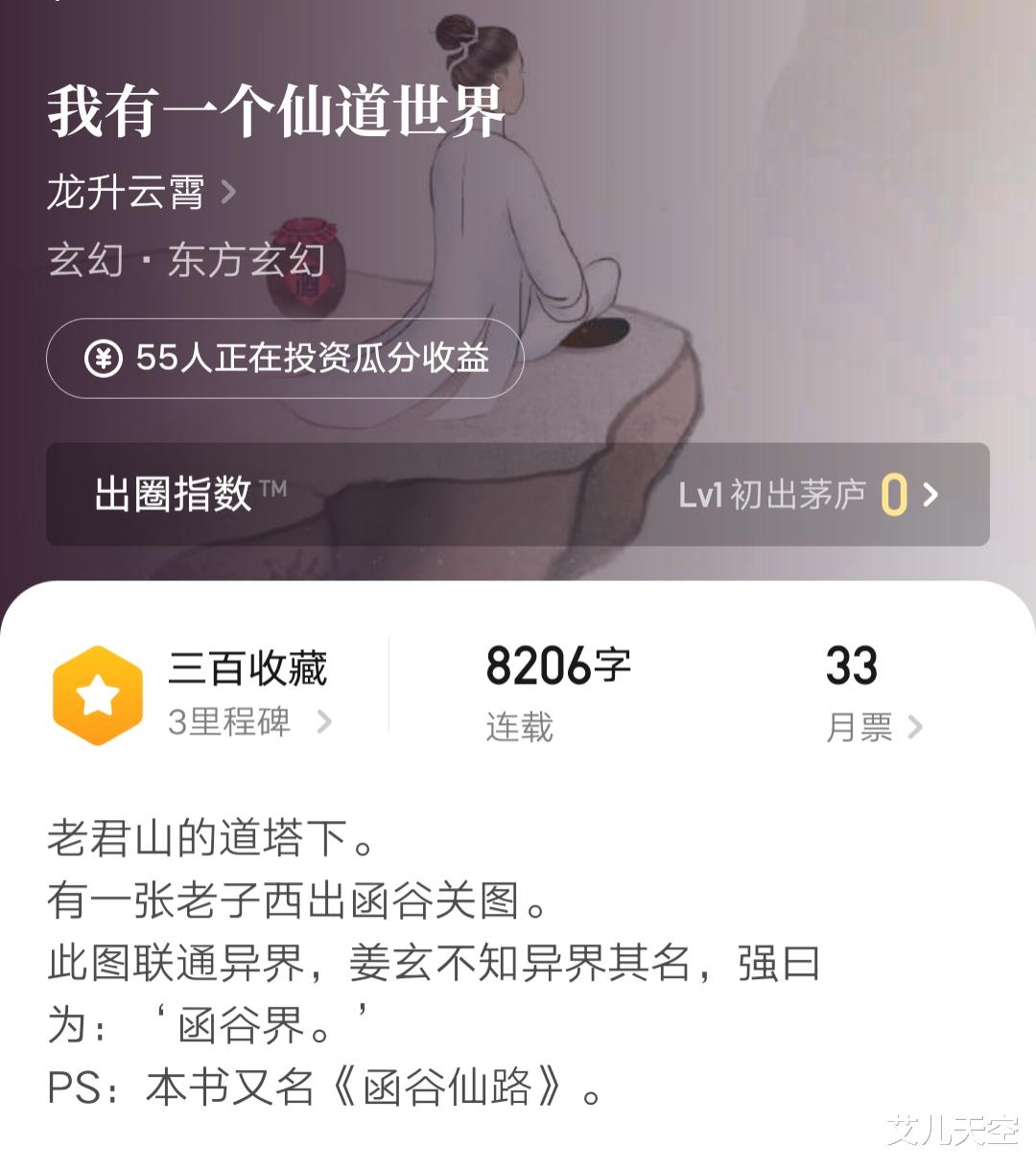 今天看到断更了一个月的龙升云霄已经开了新书《我有一个仙道世界》,书名和纯九莲宝灯的万订小说《我有一个修仙世界》一字之差。看情况也是两界文的类型,这也算是网文里比较经典的题材了。