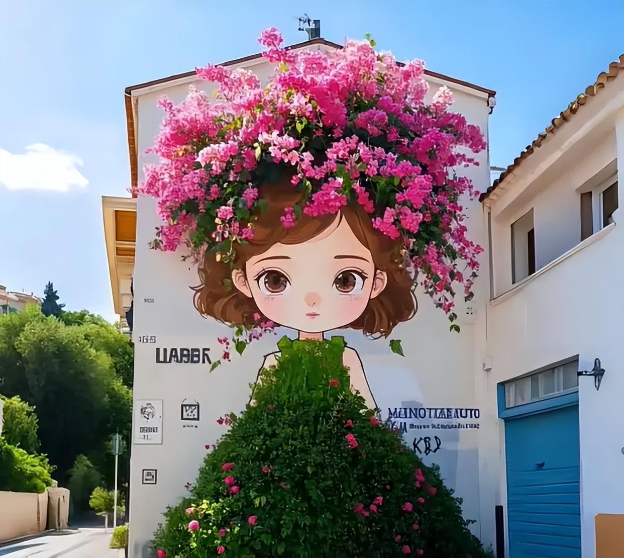 网友晒出的照片里,一株三角梅长在房屋的拐角处,以房屋的三角形角落为依托,在墙面上画出女孩子的头发与装饰,让三角梅与画作自然融合、相互衬托,画面栩栩如生。