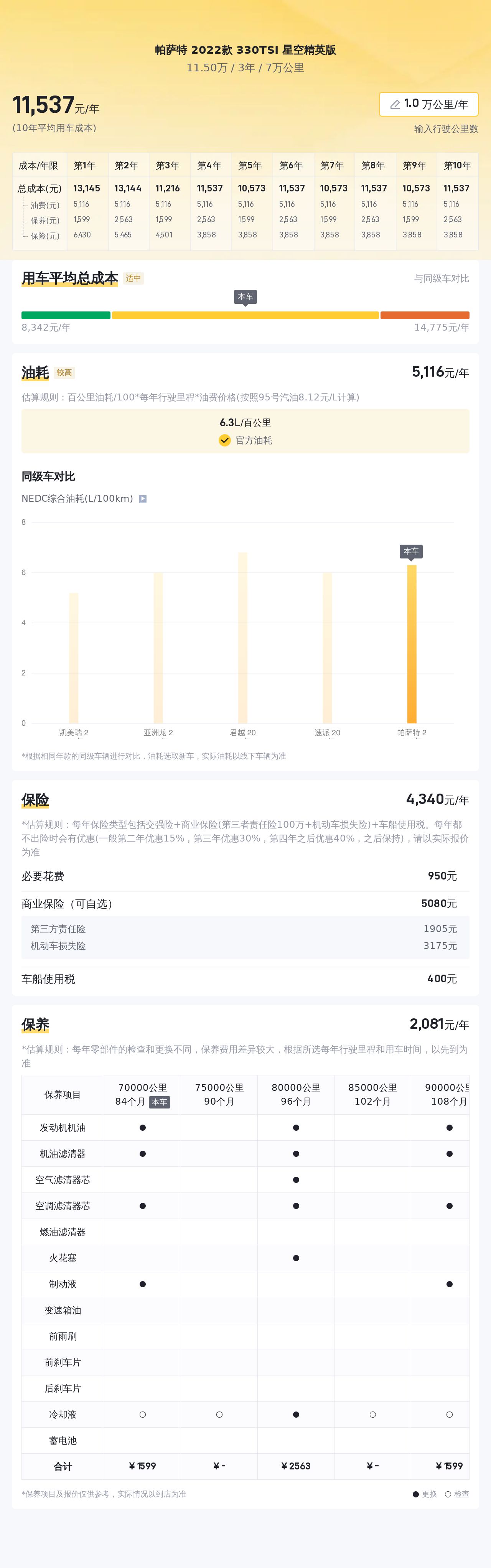 在购买二手车时,除了初始购车成本外,还需要考虑日常使用和维护的成本。我们对这款帕萨特2022款330TSI星空精英版进行了用车成本分析,并将通过图片形式向您展示详细的对比信息。这些数据将帮助您全面了解拥有这辆车所需的经济投入,包括油费、保养费、保险费等各项开支。请注意,实际费用可能会因个人驾驶习惯、所在地政策等因素而有所差异。