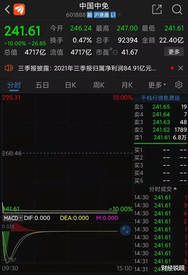受这份不太符合预期的三季报影响,今天一开盘中国中免直接低开超7%,开盘3分钟后封死跌停板,跌停板上封单接近17亿资金,投资者想跑都跑不掉。
