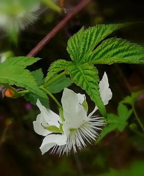 覆盆子为木质藤本,掌状复叶,花白色,果实成熟后红色,具有观赏价值,可栽培观赏利用。