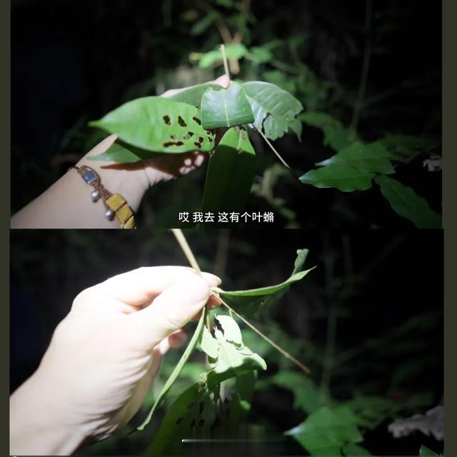 @Jason(浴桶)的自然笔记 将手电筒对准手中的一簇树叶,并慢慢向上翻转,随着他的动作,一只碧绿的叶䗛“原形毕露”,呈现在观众面前。Jason随之讲解,“她叫女神丽叶䗛,属于竹节虫目下面的一科,不过叶䗛家族横向发展,竹节虫是纵向。”