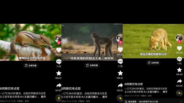 @阿斯巴有点哲 选择以动物世界的节目形式来解读马克思主义哲学基本原理。在其视频中,配合生动、可爱的动物生活画面,他会用沉稳、富有磁性的声音模仿《动物世界》的旁白,并以此为形象载体,将原本抽象的哲学知识进行生动而有趣的说明,让用户能在轻松的氛围中理解原本晦涩难懂的哲学概念;