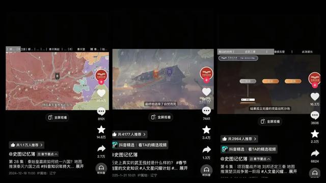 比如@史图记忆簿 通过手绘地图推演搭配主要历史事件的提炼和讲解,并辅以相关影视片段,成功将不可触摸的历史转化成可感知的地理坐标,清晰而又直观地串联起了一幅幅历史画卷。截至目前,账号共发布54条作品,粉丝量已经达到110万;