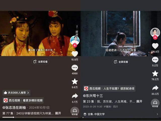 于人文领域,过去一年,抖音涌现出诸多优质创作者,以各式各样的叙事手法与表达形式,引领观众沉浸式享受一场场人文盛宴。比如,@张志浩在剥柚 将《红楼梦》与当代人际关系相结合,对书中人物进行了新颖视角的解读,如“210分钟理解薛宝钗”“240分钟只为黛玉”,他本人则在深度解读中成为观众的“文学搭子”;@东兴苟十三 则将镜头对准了苏轼、王维等古代名人,将他们的生平故事娓娓道来,让原本只存在于书本里的历史人物形象变得饱满立体。