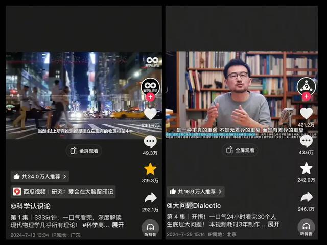 如在@米三汉 之外,@科学认识论 用333分钟的时长为用户深度解读了过去100年人类顶级物理学家呕心沥血研究出的现代物理学知识体系,详细介绍了爱因斯坦、霍金、杨振宁、薛定谔等30多位物理学家的贡献,引来一众网友围观。截至目前,视频获赞540万,收藏量高达319万;@大问题Dialectic 发布的长达24小时的哲学视频,吸收了上百位哲学家思想精髓,探究了人生的30个底层大问题,给用户带来了全新的思考角度,视频共获赞421.2万;