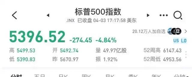 标普500一天暴跌4.84%,道琼斯直接狂泻1679点,创下2020年疫情冲击以来最狠的单日跌幅,纳斯达克更惨,20%的跌幅,让交易员们手抖到按不动键盘。