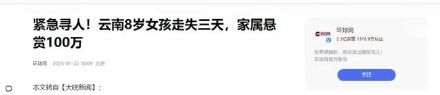 信息源:紧急寻人!云南8岁女孩走失三天,家属悬赏100万环球网2025-01-22