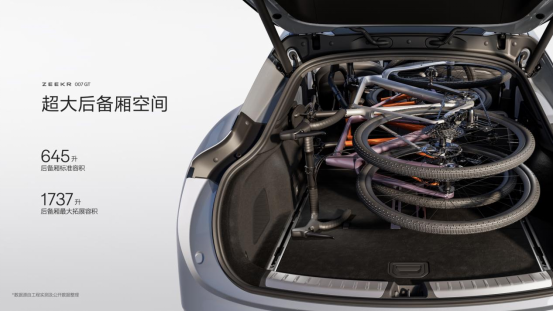 极氪猎装更能装。得益于浩瀚原生纯电架构L113最优布局,极氪007GT拥有2925毫米超长轴距,83.5%超大得房率,车内纵向有效空间接近2.5米,同级最大。后排腿部空间超越同级轿车和旅行车,头部空间也很充裕。645升后备厢容积超过80%同级SUV,后排座椅放倒后可拓展至1737升,轻松容纳3辆公路自行车。