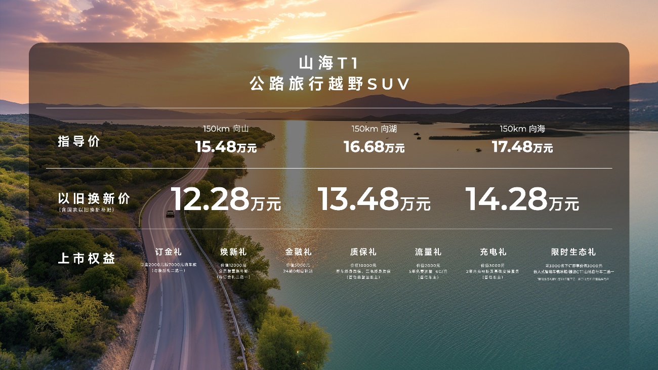 据悉,捷途山海T1本次共推出“向山” “向湖”“向海”三款车型,并基于自然之风释出“雪山银”“鎏沙金”“青山翠”“冰川白”“极夜黑”等多款车色,售价区间15.48万—17.48万。新车上市期间,捷途山海T1还为用户带来了多重购车好礼:即日起,订购捷途山海T1的用户,即可享受“限时生态礼”“订金礼”“焕新礼”“金融礼”“质保礼”“流量礼”“充电礼”七大权益,覆盖购买、选择金融方案、质量保障、用车便捷等方方面面,捷途山海T1目标深度践行“用户为王”思维,全方位提升用户体验。