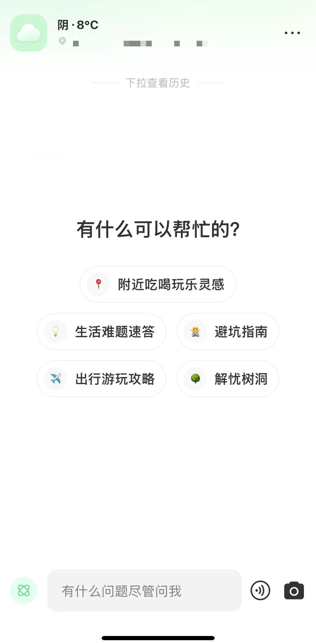 点点的主页面注重定位信息且十分简洁,主页面仅有搜索框,“有什么可以帮忙的?”引导用户发问,以及在此之下几个常见的生活问题标签来充当常规应用中的类目导航栏。
