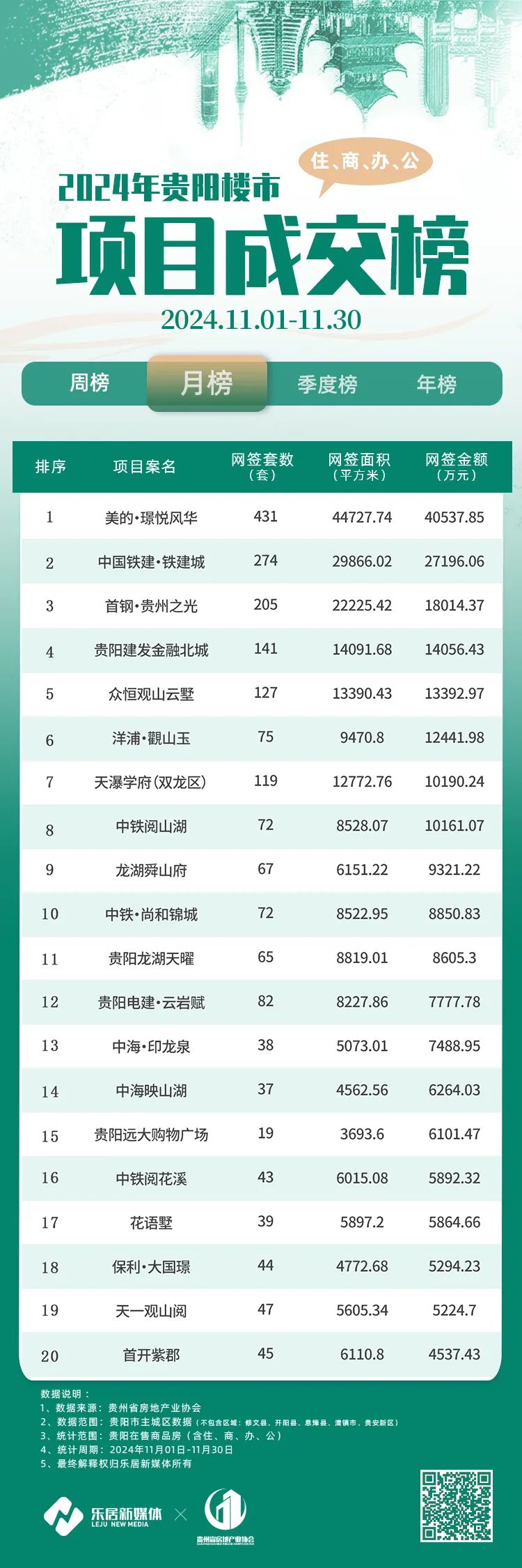 据贵州省房协消息,贵阳楼市11月商品房网签总金额为369283.68万元(约合36.93亿元),网签总面积为383046.02平方米,网签总套数为3514套,从销售金额规模来看,有8个项目销售金额超过1亿元。其余12个项目销售金额均在0.45亿元以上。
