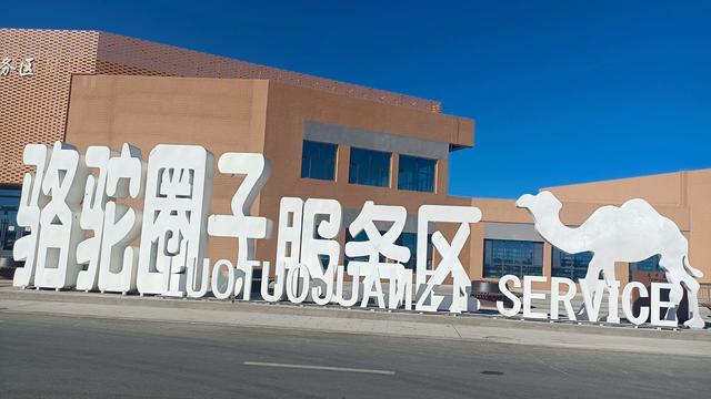 大巴车一路前行,终于看见绿色了,我们都特别兴奋,就像荒漠里看见一片绿洲。这里是骆驼圈子服务区,行驶了6个多小时,终于感觉到了人间烟火气。此地旧时为丝绸之路驿站,来往驼队多,有多处骆p驼棚圈,因此得名。
